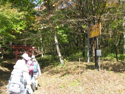 榛名湖温泉の駐車場から数分の所に赤い鳥居のある烏帽子ヶ岳登山口があり、ここから入山。 登山口から、およそ20分で烏帽子ヶ岳から鬢櫛山の稜線の分岐に着く。ここから数分でまた鳥居があり、狛犬が迎えてくれる。